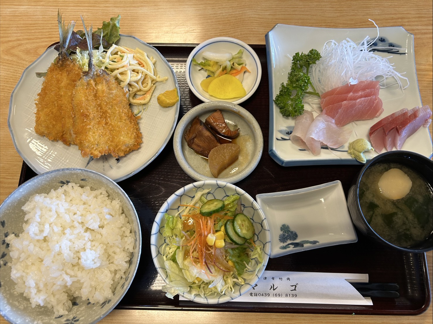 定番メニューはマルゴ定食(写真 アジフライと刺身)、黄金定食(アジフライとアジのたたき)です。