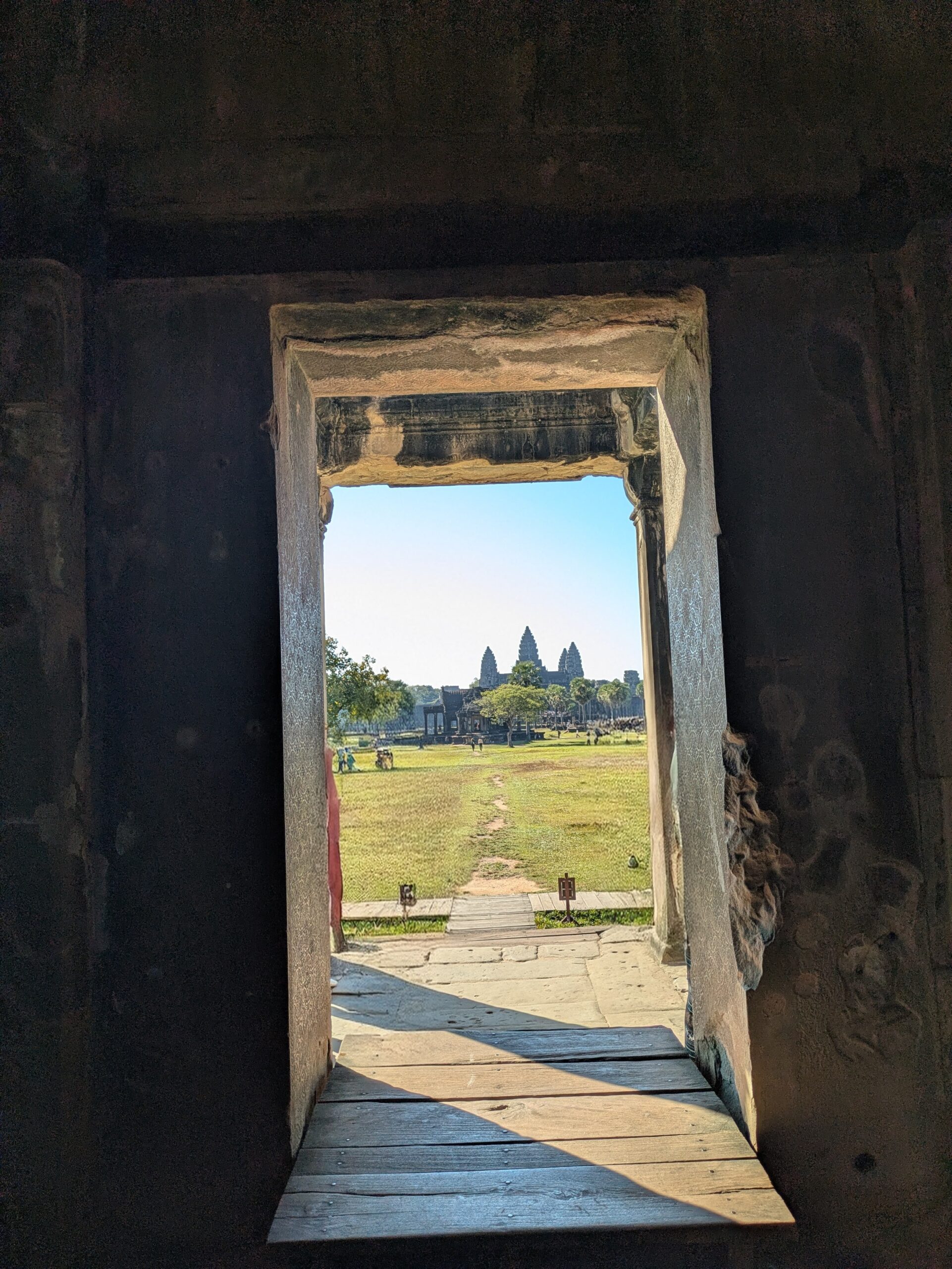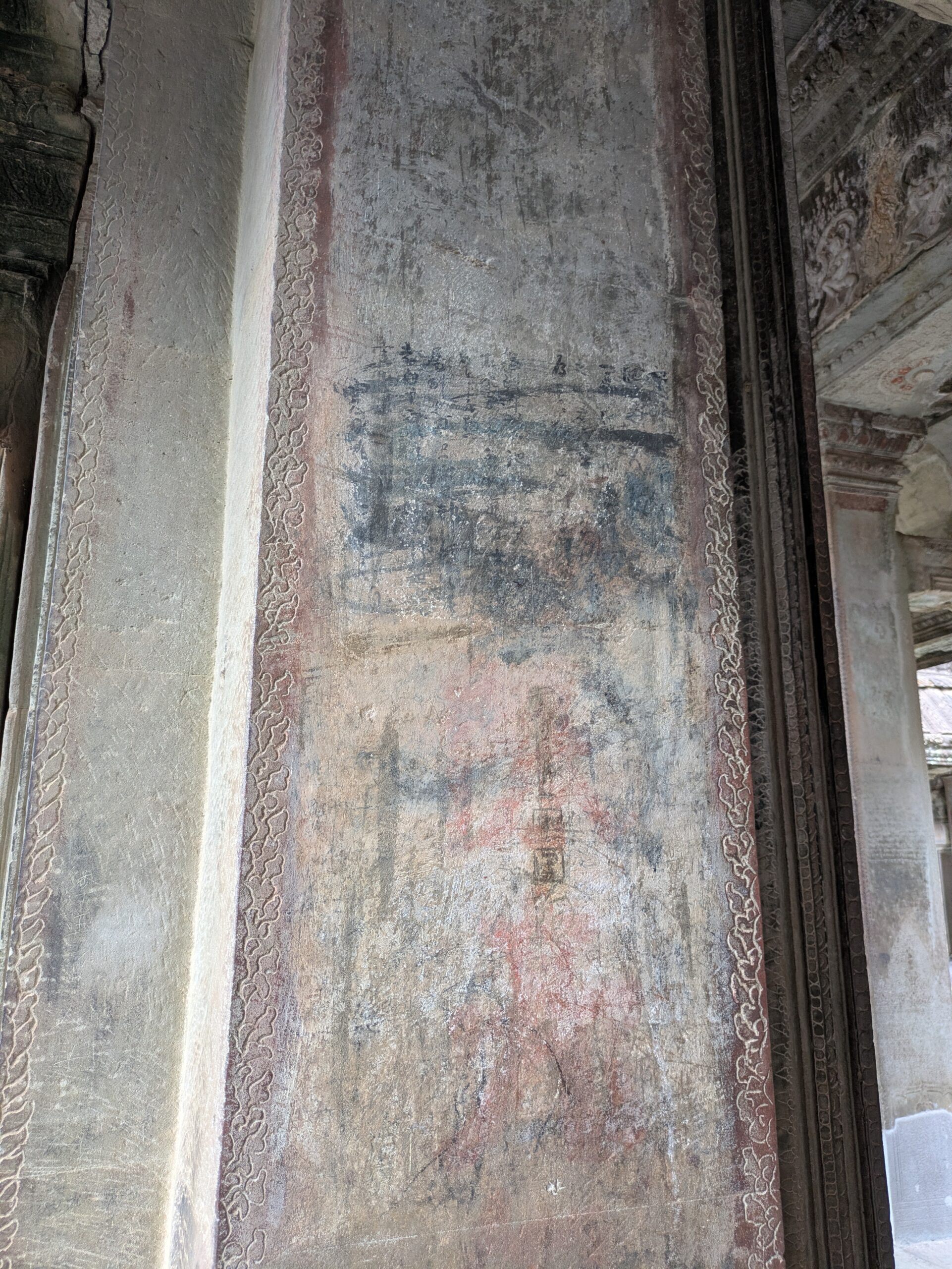 アンコールワットは、お濠に囲まれ中心の祠を3つの回廊で構成されています。落書きは、第1回廊と第2回廊を結ぶ十字路を右に曲がるとお祈りをする場所があります。その入り口の右側のゲートをくぐって振り向いたところの柱にあります。